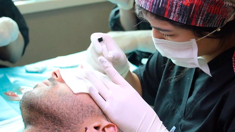 La anestesia local se aplica en el trasplante capilar DHI.  El tiempo de aplicación de la anestesia es muy corto.  El dolor de las agujas de anestesia local se evita aplicando sedación antes de la anestesia.  Gracias a la sedación y anestesia local, no se siente dolor durante la operación.