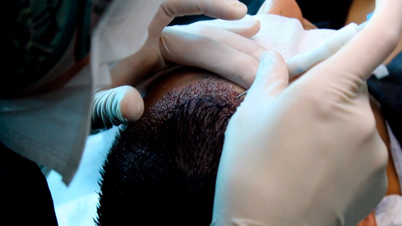 Los folículos pilosos en el área donante se recolectan uno por uno con una herramienta especial.  También contiene un pedazo de cuero cabelludo en los injertos recogidos.  Como no hay apertura de canal en la técnica DHI, después de que se recolectan los folículos capilares, se inicia la fase de trasplante de los folículos capilares.